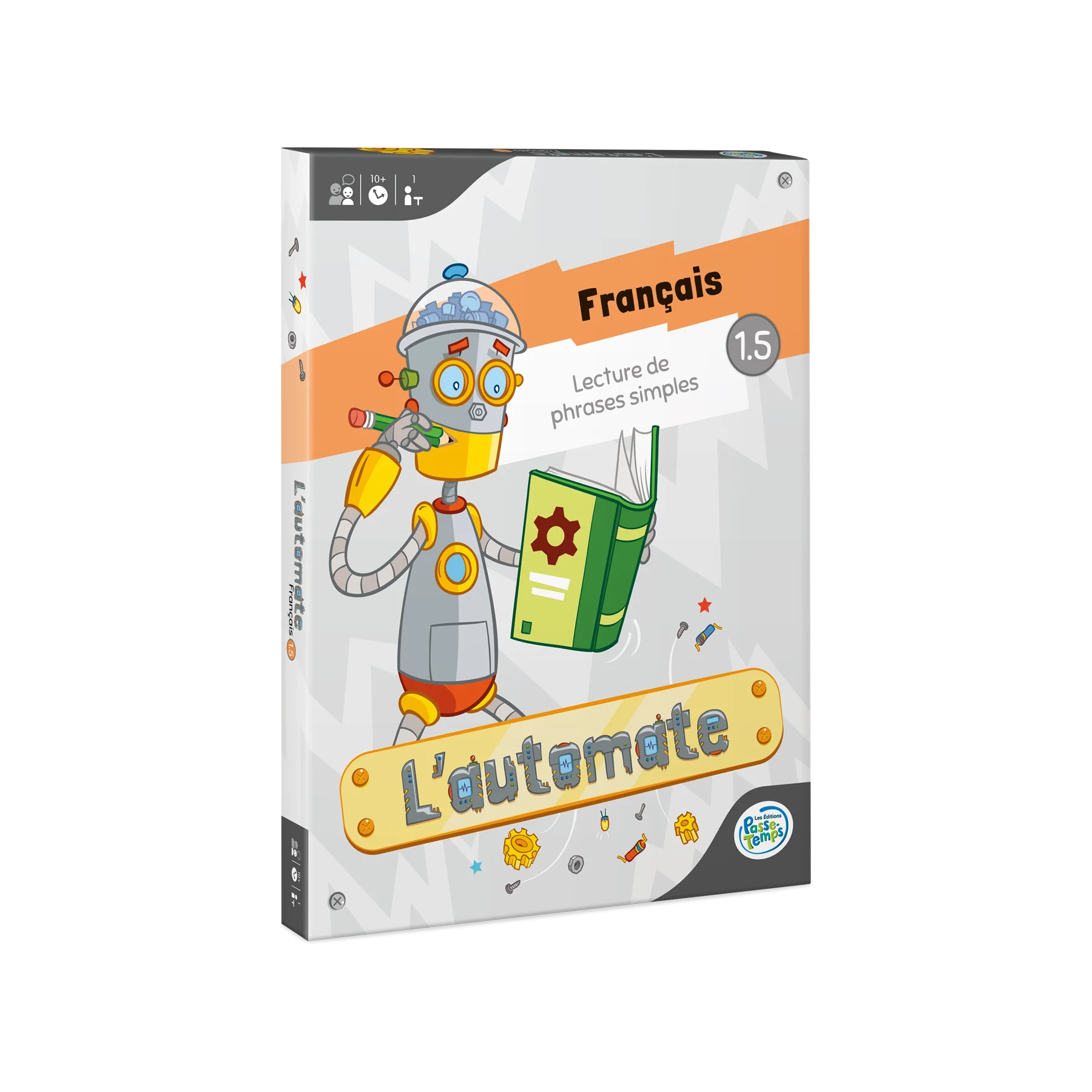 Jeu individuel d’association destiné aux élèves du 1er cycle du primaire ciblant l’habileté à lire et à cerner l’information importante dans des phrases ainsi qu’à identifier des mots en utilisant le sens global des phrases. Le joueur doit assembler les fils dans la tête du robot pour programmer ses actions.