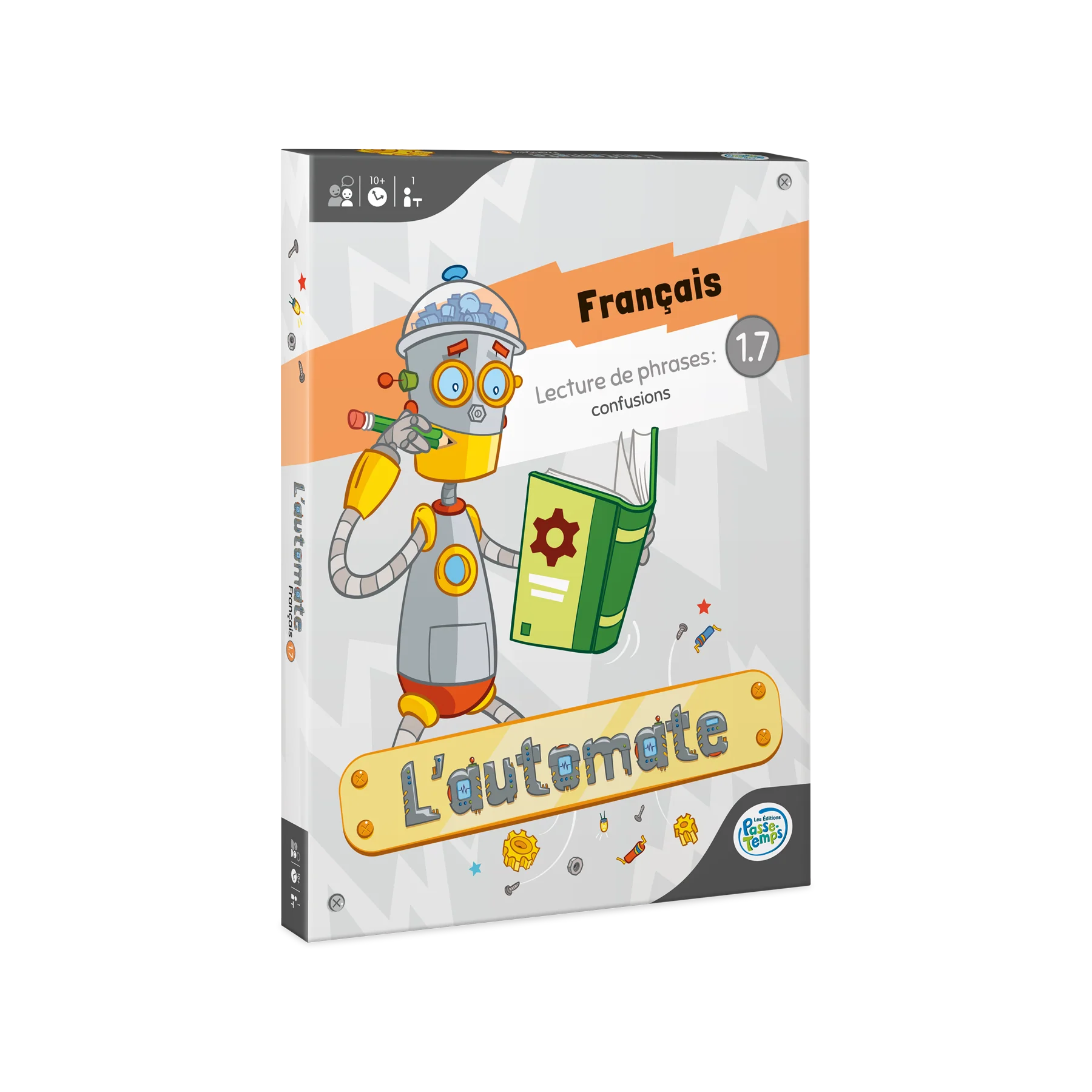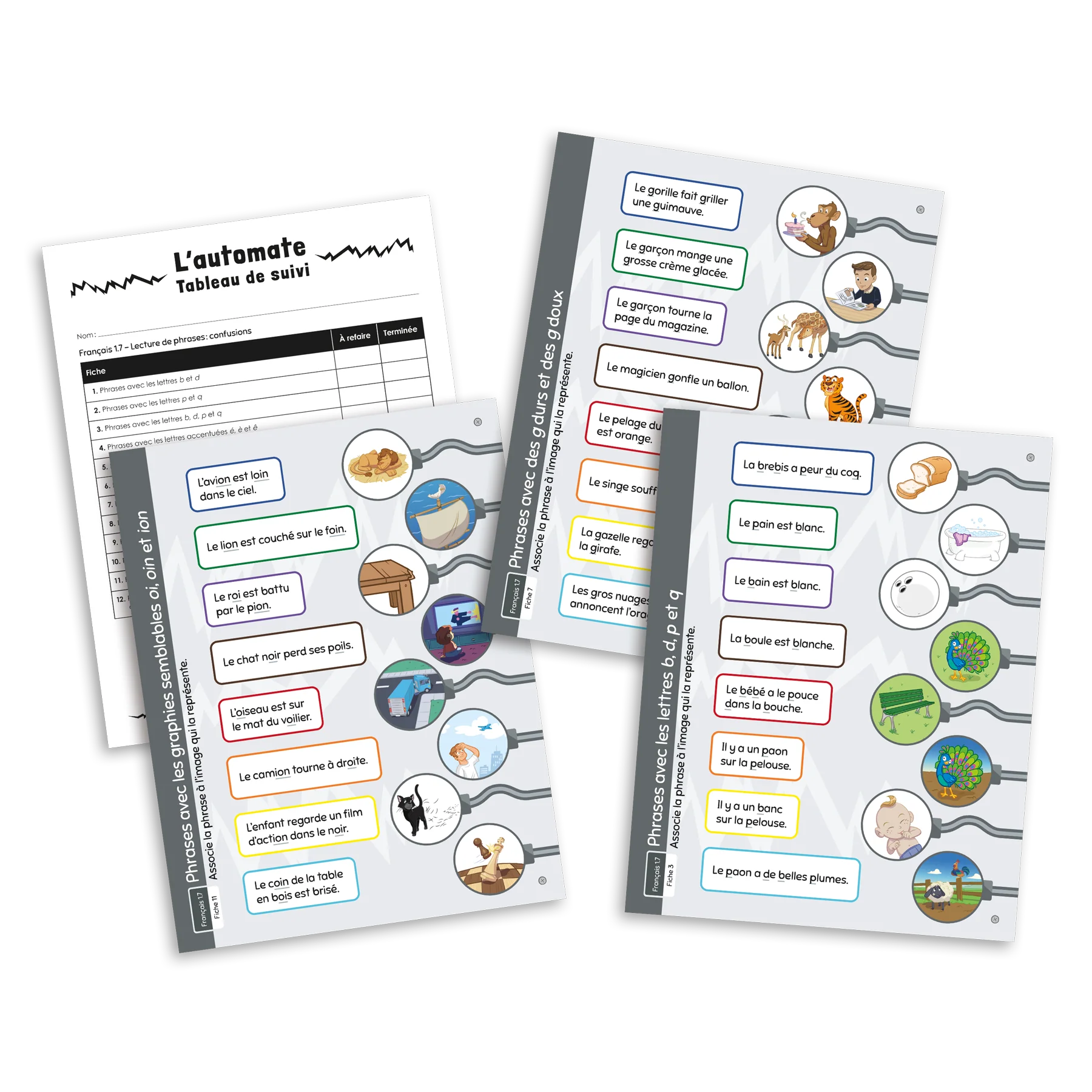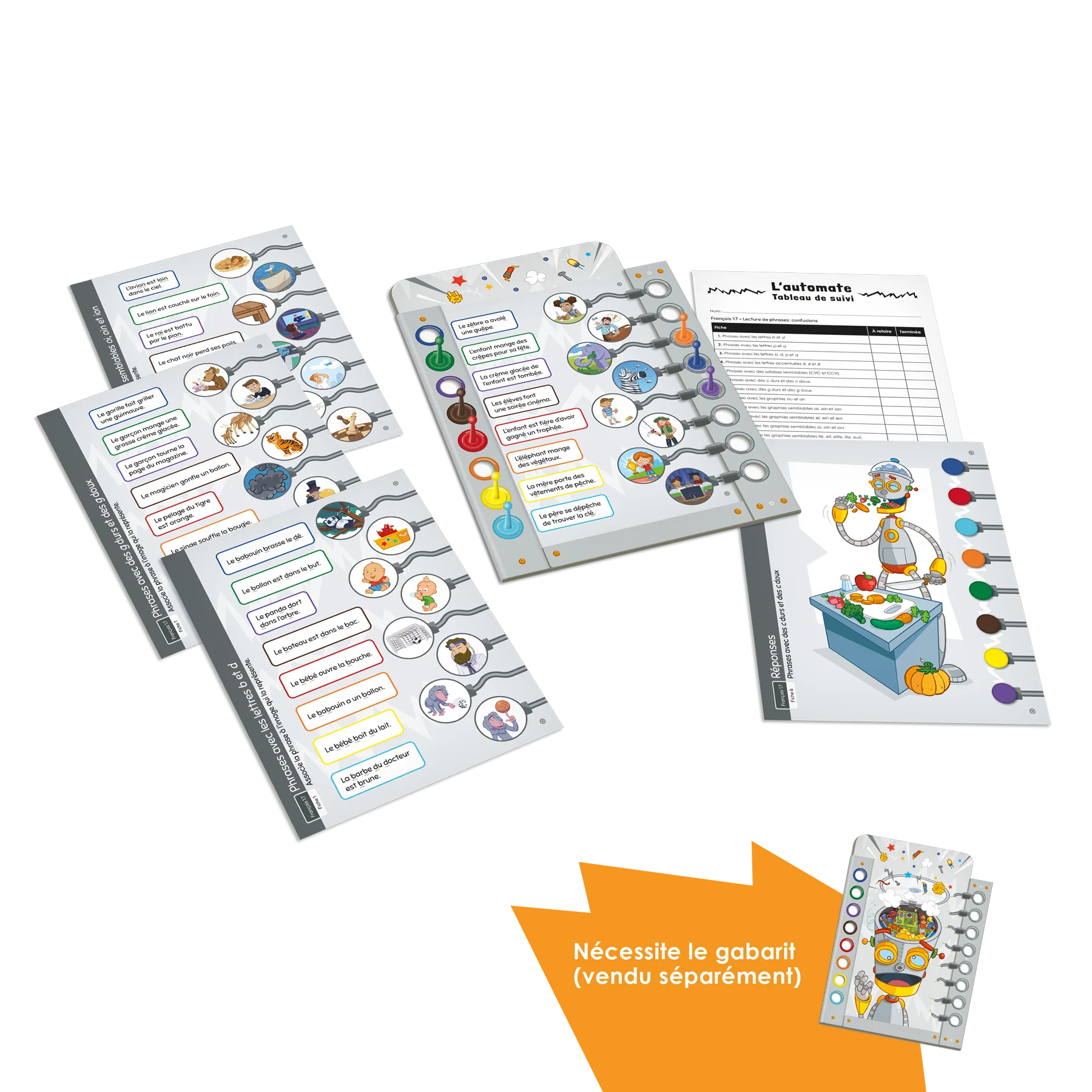 Jeu individuel d'association destiné aux élèves du 1er cycle du primaire ciblant l'habileté à lire des phrases composées de graphèmes ou de syllabes qui peuvent être source de confusion chez l'apprenti lecteur (ex. : des graphies semblables, des graphies contextuelles, des lettres accentuées, des structures syllabiques semblables). L'ensemble comprend 12 fiches de jeu dans lesquelles le joueur doit associer des phrases à des images pour assembler les fils dans la tête d'un robot et programmer ses actions.