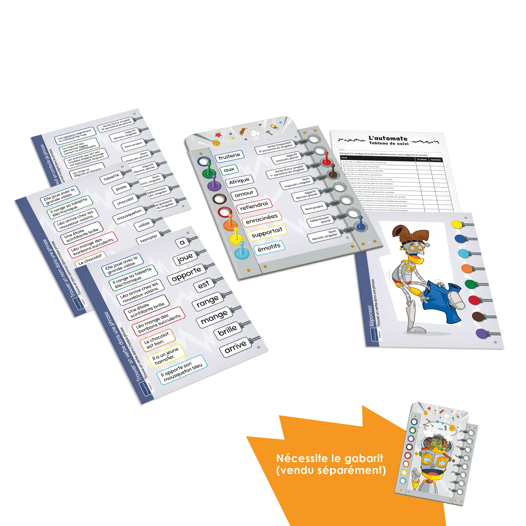 Jeu individuel d’association destiné aux élèves du 2e cycle du primaire ciblant le développement de l’habileté à déterminer la classe d’un mot ainsi qu’à repérer les marques d’accord du genre et du nombre d’un nom ou d’un adjectif. Le joueur doit assembler les fils dans la tête du robot pour programmer ses actions.