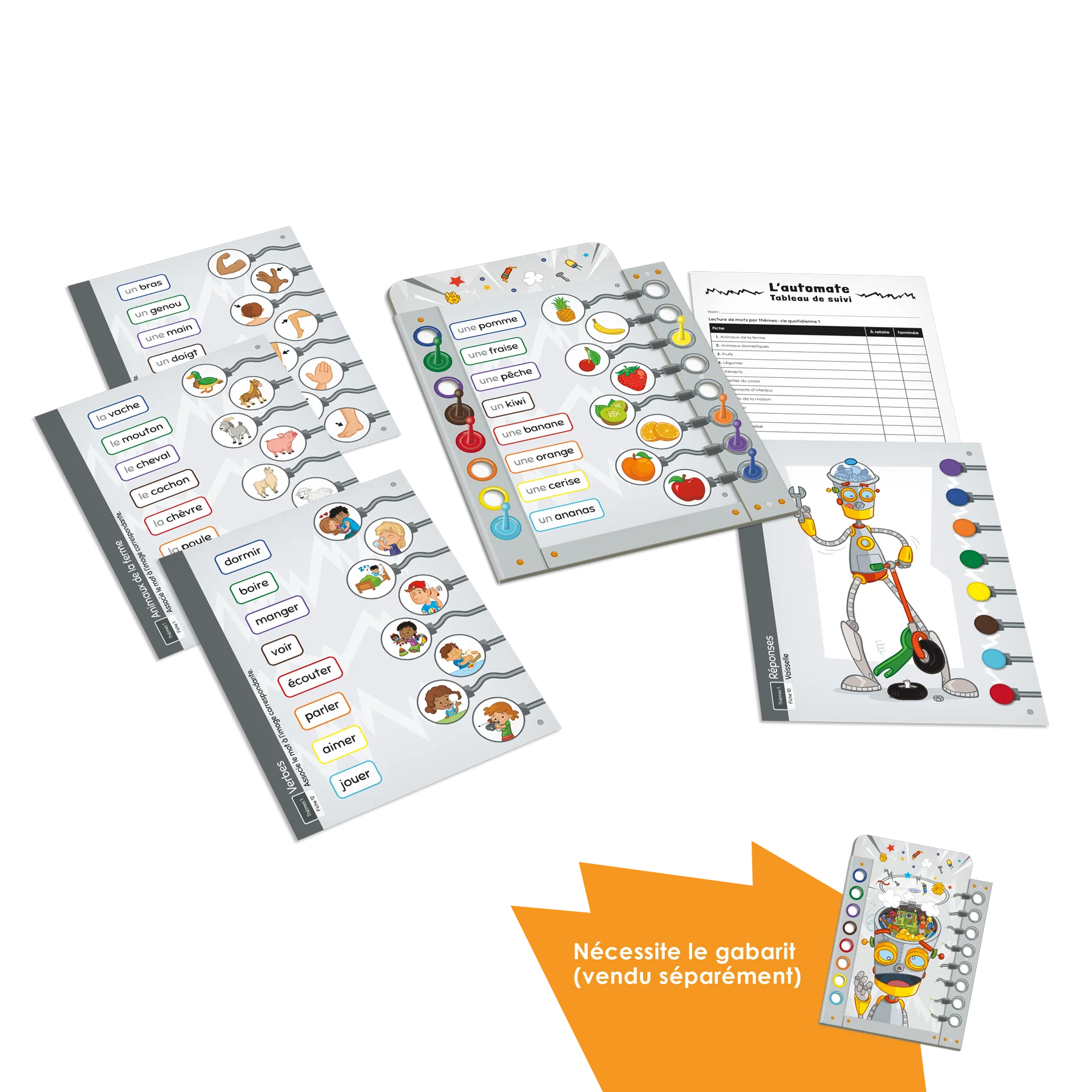Jeu individuel d’association ciblant le développement du vocabulaire en français langue seconde. Le joueur doit assembler les fils dans la tête du robot pour programmer ses actions. Les fiches du boitier L’automate – Lecture de mots par thèmes : vie quotidienne 1 proposent chacune un réseau lexical axé sur les mots de la vie quotidienne (ex. : les animaux domestiques, les fruits, les parties du corps). Des déterminants accompagnent les noms communs afin que les joueurs puissent développer leur connaissance du genre des mots en français (ex. : la vache, un lapin).