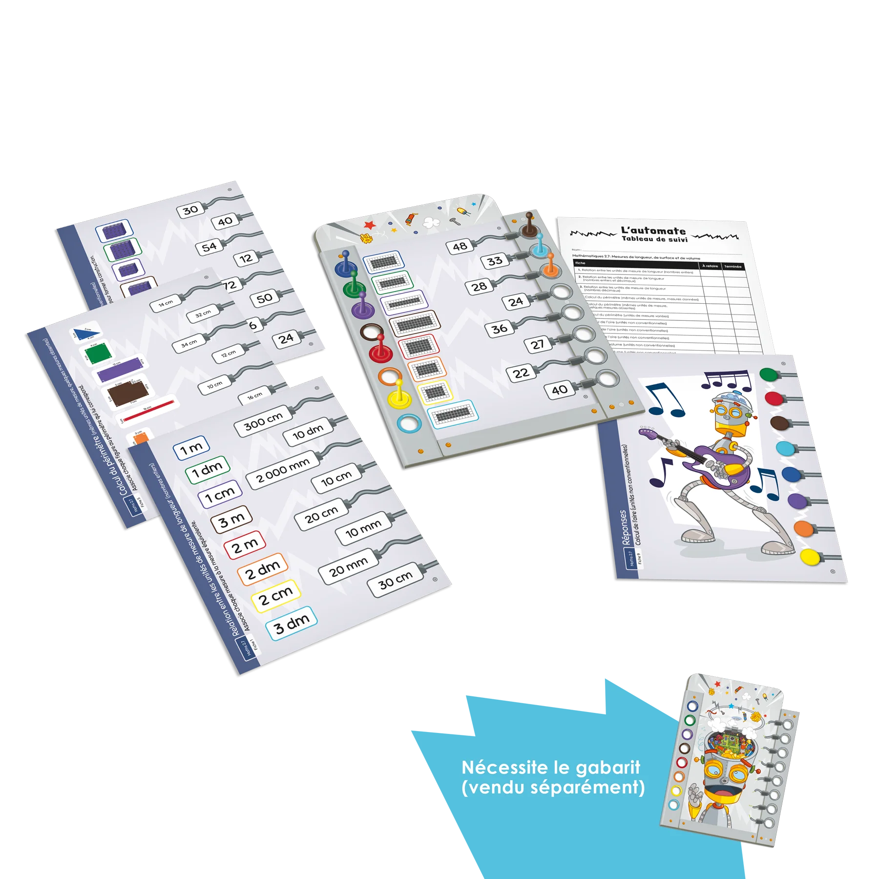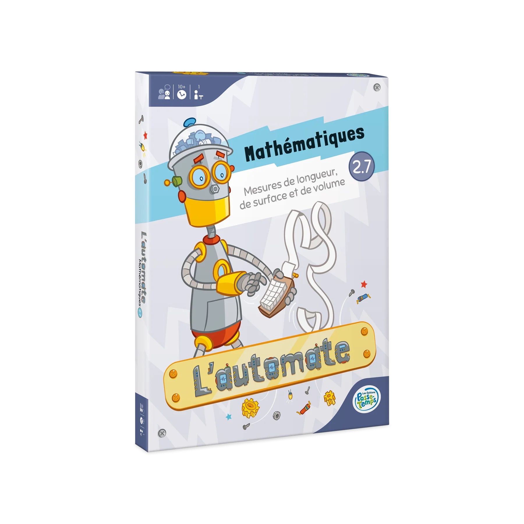Jeu individuel d'association destiné aux élèves du 2e cycle du primaire ciblant différentes habiletés mathématiques relatives à la mesure de longueur, de surface et de volume. Le joueur doit associer des mesures de longueur, de surface ou de volume pour assembler les fils dans la tête du robot et programmer ses actions. La série comprend 12 fiches de jeu.