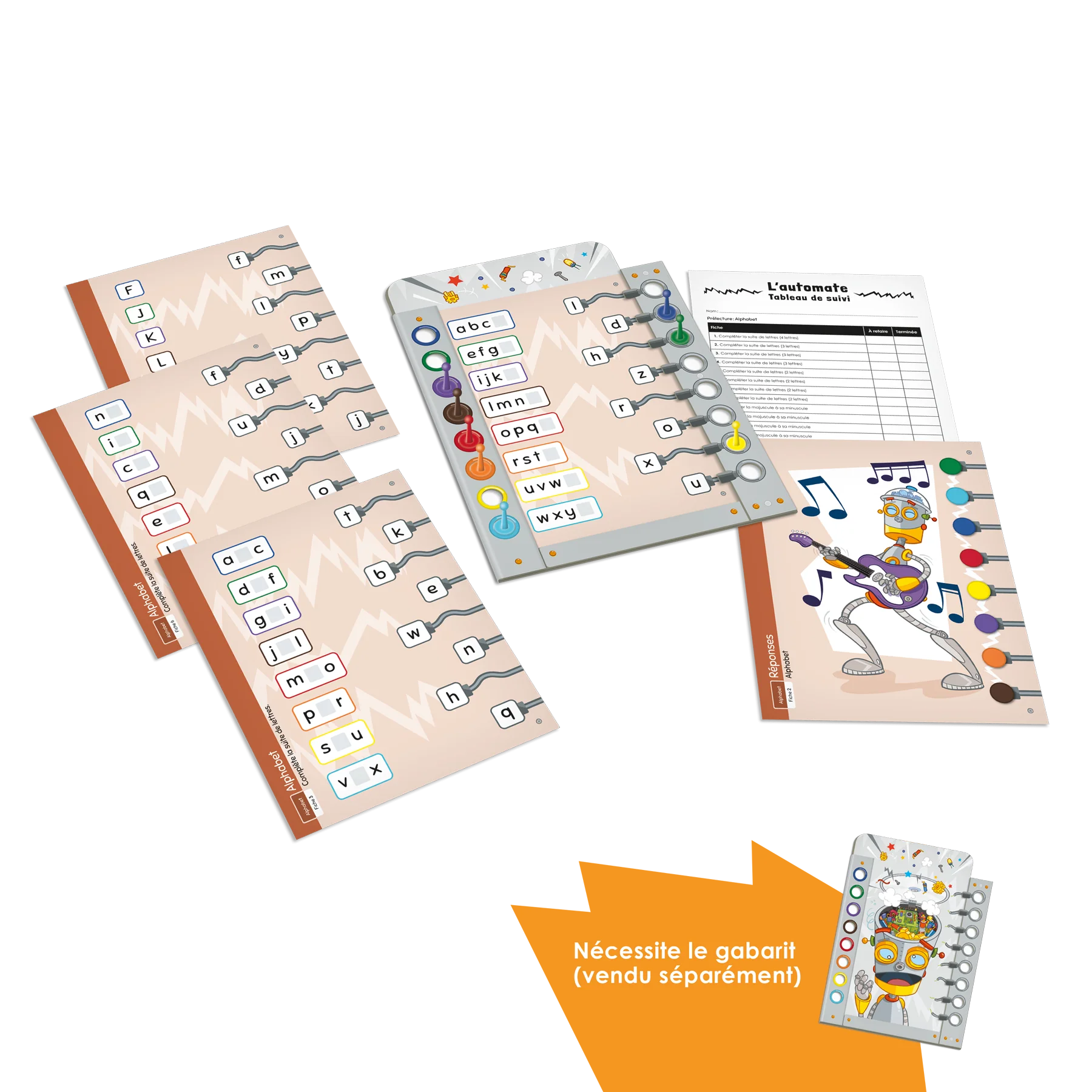L’ensemble comprend 12 fiches de jeu dans lesquelles le joueur doit compléter des suites de lettres ou associer des lettres majuscules à des lettres minuscules.