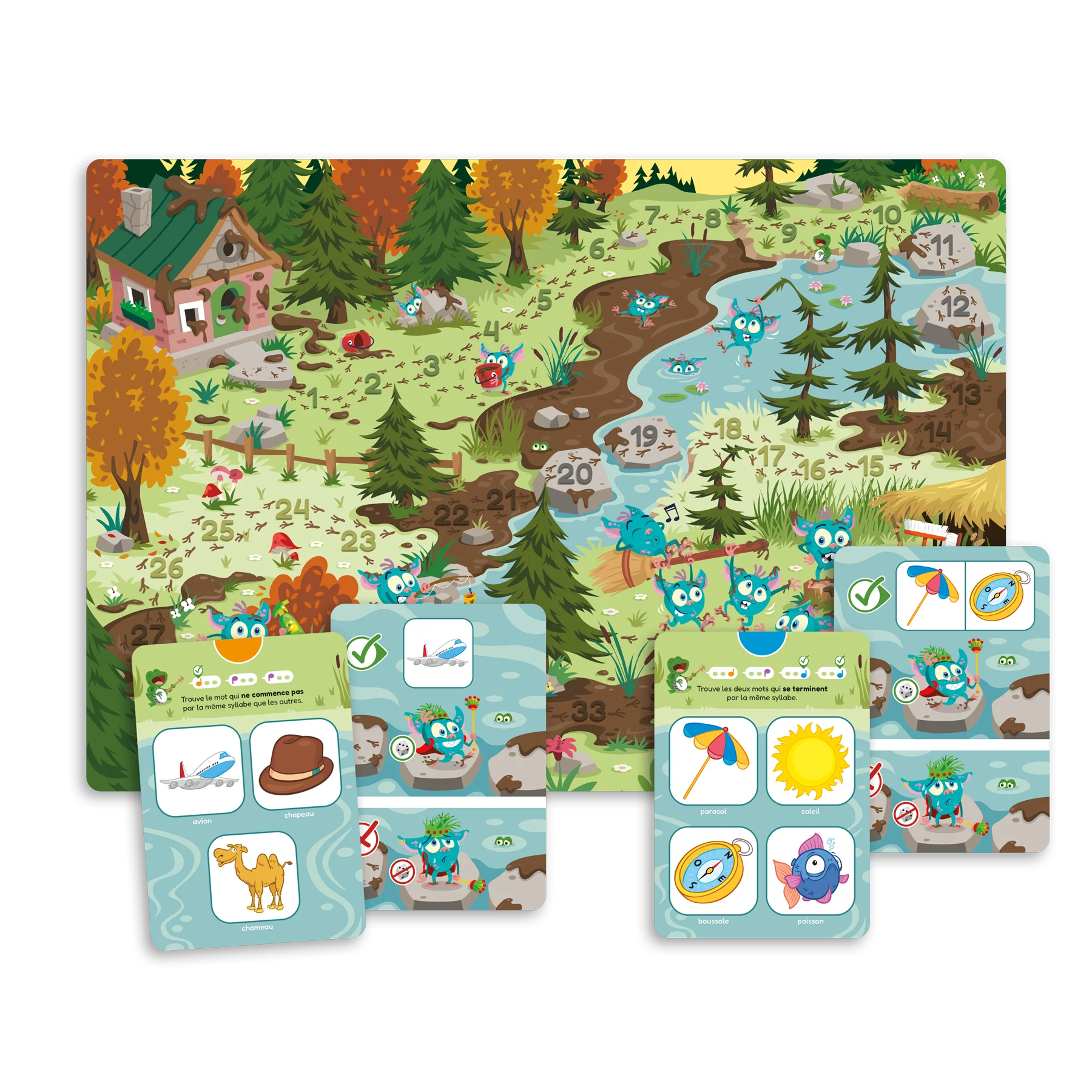 - Au niveau 1, les joueurs analysent trois mots illustrĂ©s sur une carte. Ils doivent trouver celui qui ne commence pas par la mĂȘme syllabe que les autres (p. ex.: banane, bateau, tuba).