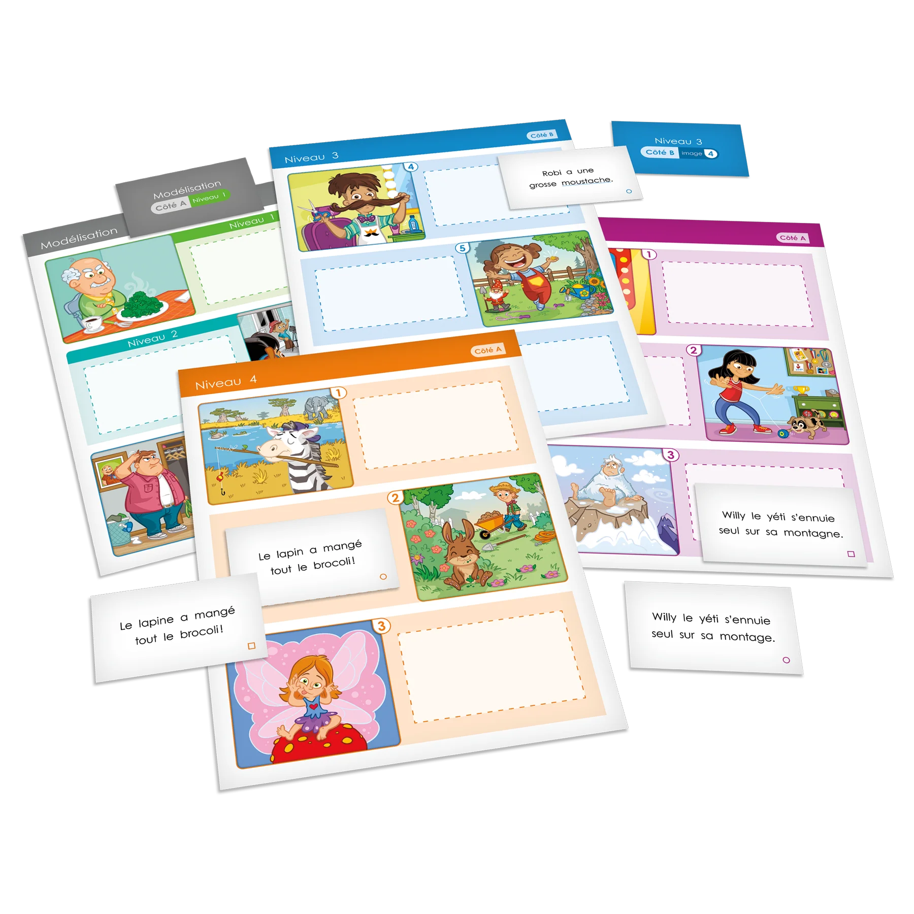 S’il le souhaite, l’intervenant peut utiliser le matériel selon une démarche d’enseignement explicite. Il effectue d’abord un modelage avec la planche de jeu et les cartes prévues pour la modélisation. Le joueur poursuit avec la pratique guidée en utilisant un côté d’une planche de jeu et il réalise ensuite l’activité de façon autonome avec l’autre côté de la planche.