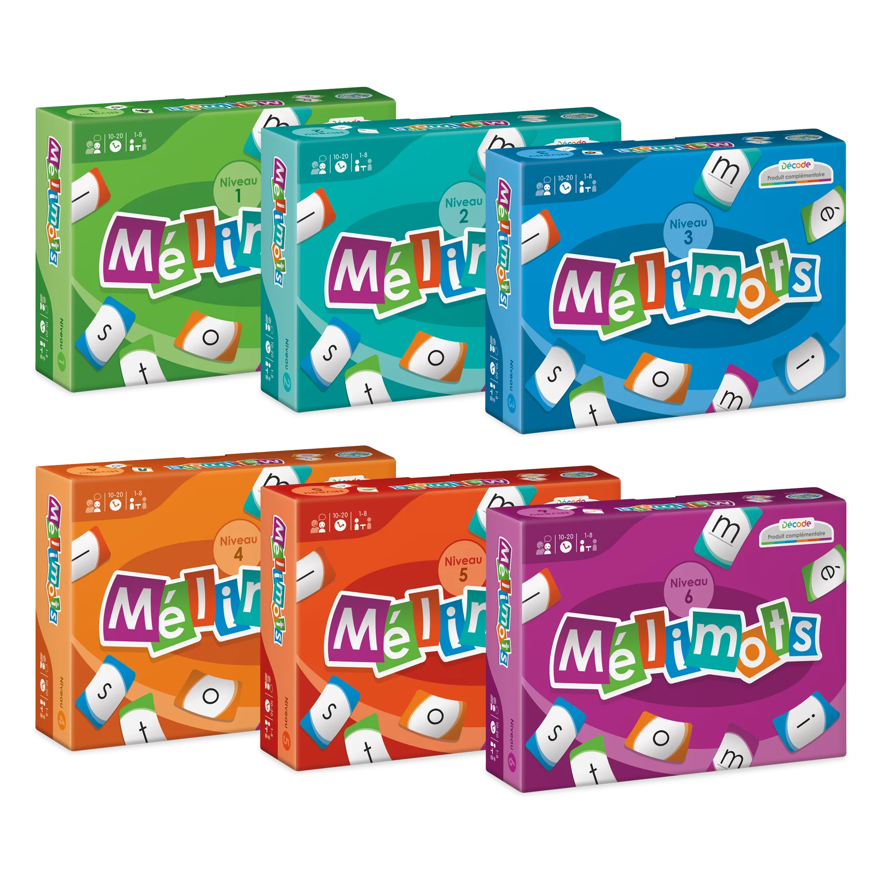 Série de six jeux de lecture correspondant aux six niveaux Décode, dans lesquels les joueurs doivent former des mots avec des cartes-lettres mélangées. Chaque jeu permet de consolider l'apprentissage des correspondances graphèmes-phonèmes du niveau ciblé et de s'exercer à former des mots avec des graphèmes.