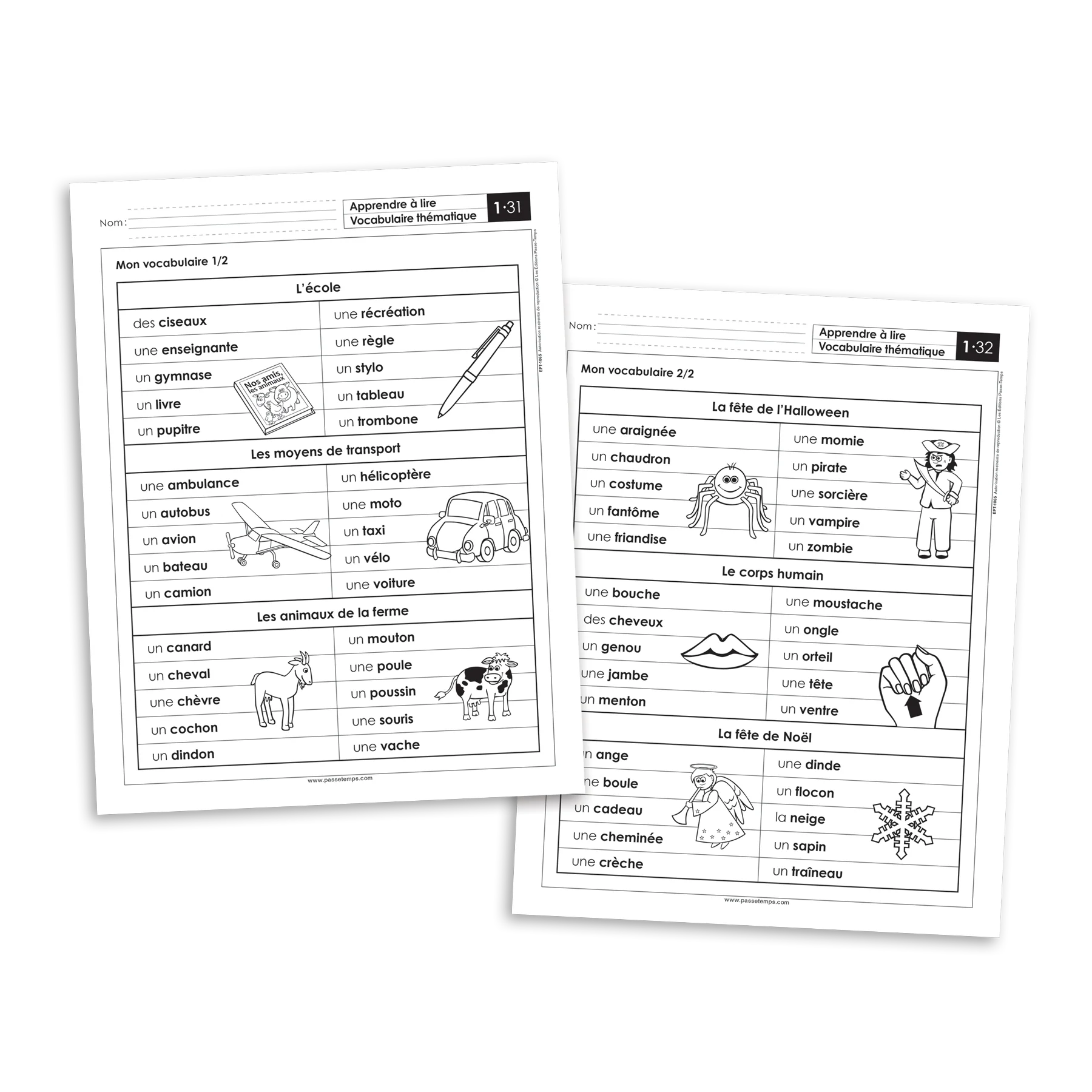 Ensemble de fiches reproductibles variées, amusantes et attrayantes conçues pour les élèves de première année sur les thèmes suivants : l'école, moyens de transport, animaux de la ferme, l'Halloween, le corps humain et Noël.
