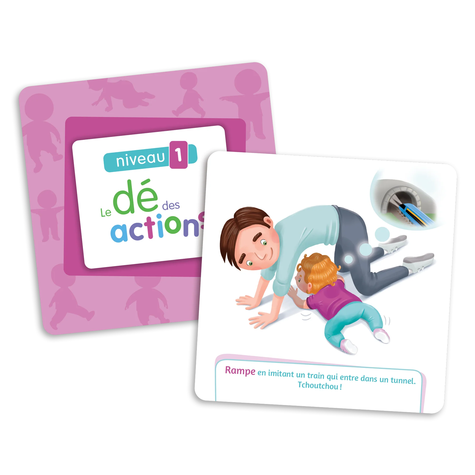 - Le niveau 1 (cartes roses) s’adresse aux enfants de 1 à 2 ans et propose des actions telles que ramper, marcher à quatre pattes, faire rouler le dé et marcher comme un animal (avec l’aide d’un adulte au besoin).