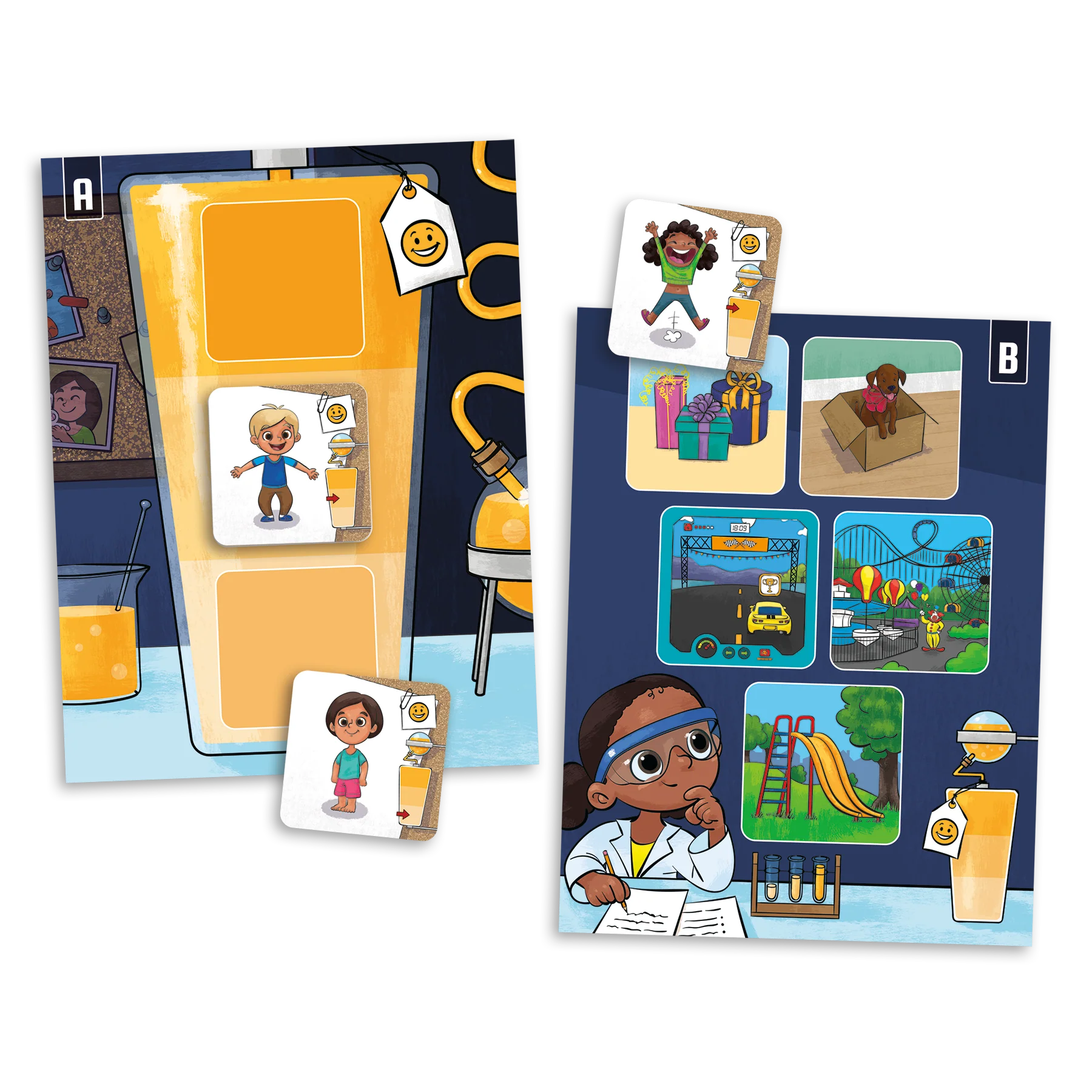 Le laboratoire des émotions est conçu pour aider les enfants de 4 ans à 7 ½ ans à reconnaitre des émotions exprimées à différents degrés d’intensité. Le jeu les amène progressivement à distinguer les émotions et leurs nuances en portant attention aux expressions faciales et aux gestes des personnages. Les différentes façons de jouer en font un jeu évolutif qui permet aussi aux enfants de réfléchir au lien entre une réaction émotionnelle et sa cause ainsi qu’au contrôle des émotions dans différentes situations.