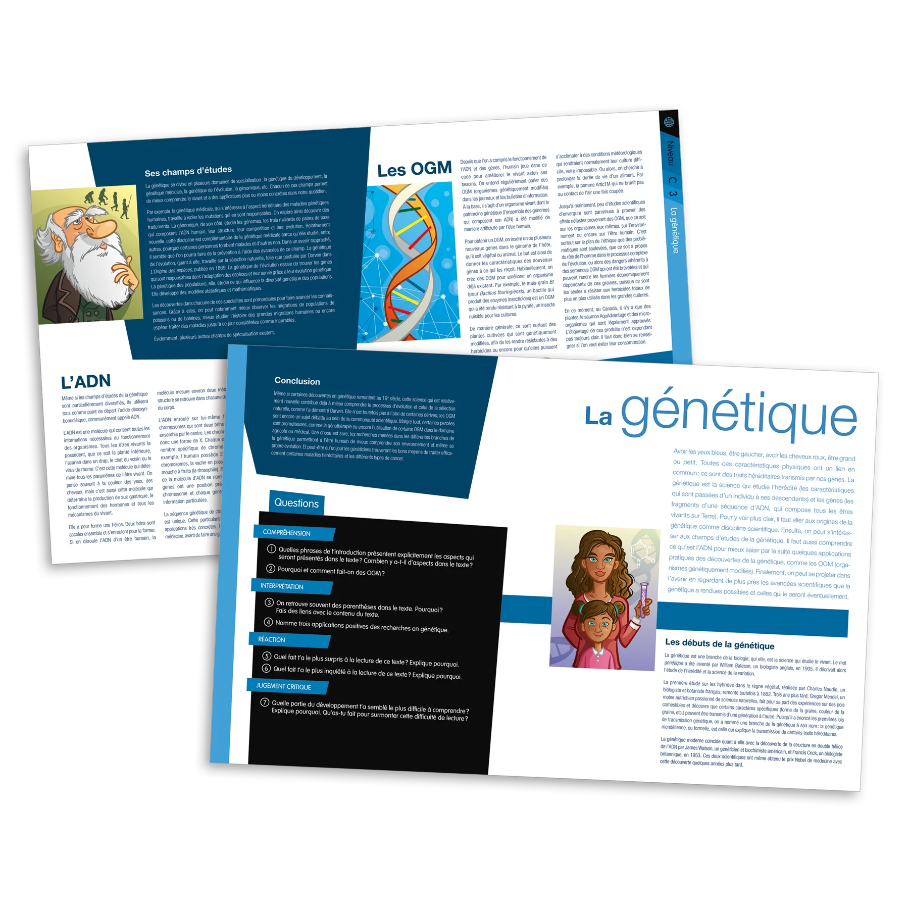 Chaque fiche comporte plusieurs questions regroupées selon le type de question (compréhension, réaction, interprétation, jugement critique). La durée des fiches (longueur du texte et des questions) a été conçue pour que les fiches puissent se réaliser en une période (pour la plupart des élèves). La boite inclut les fiches imprimées (carton laminé) et également la version PDF (pour un usage à l'écran).